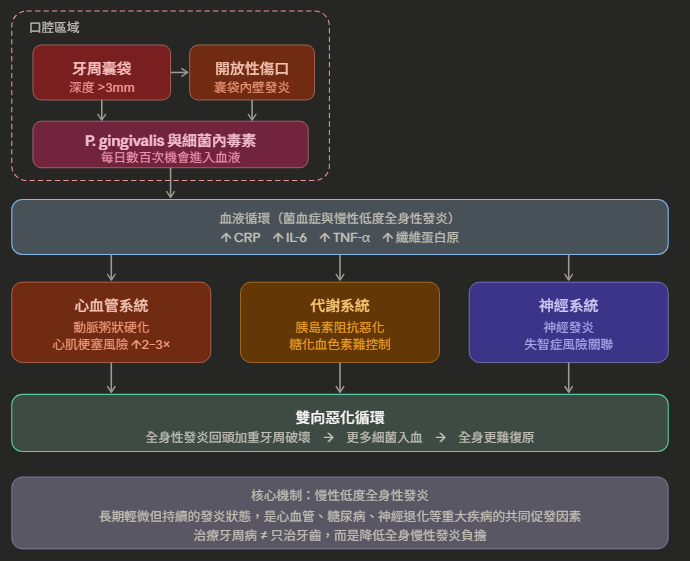 牙周病與全身性疾病的關係,不是單向的「牙齒問題導致身體問題」,而是互相強化的雙向循環。